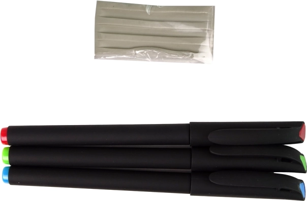 Komplet vsebuje 3 barvne flomastre in modelirno maso, ki pritrdi šablone na papir. Tako prepreči premikanje in zagotovi čiste linije brez razmazovanja.