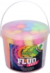 Komplet vsebuje 20 kos fluorescenčnih kred v priročnem vedru.