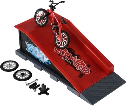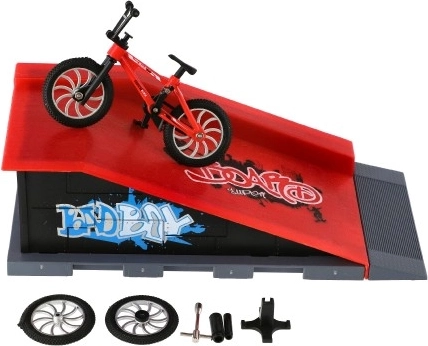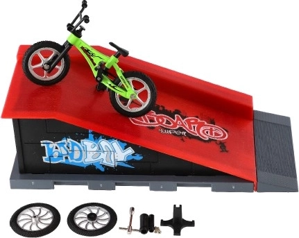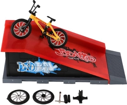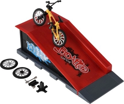 Ta set prstnega kolesa z rampo prinaša kompakten skatepark neposredno na vašo mizo. Mini BMX z zamenljivimi deli je idealen za treniranje trikov, skokov in natančnih pristanekov. Zahvaljujoč vijačnim delom si kolo zlahka prilagodite in se naučite osnov mini servisa – od menjave koles do pegov.