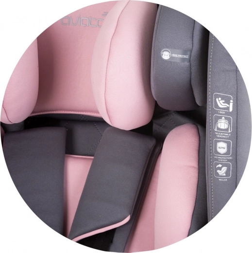 Za manjše otroke omogoča namestitev v nasprotni smeri vožnje (40–105 cm), za večje v smeri vožnje (100–150 cm). Pettočkovni pasovi z mehkim oblazinjenjem zagotavljajo čvrsto in udobno pripenjanje, snemljiva in pralna prevleka pa olajša vzdrževanje.