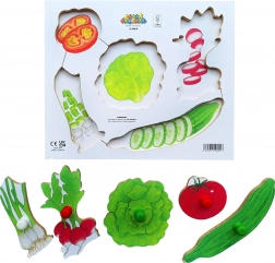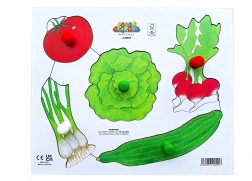 To leseno puzzle omogoča otrokom, da se naučijo prepoznavati različne vrste zelenjave. Čepki na sestavljankah omogočajo enostaven oprijem in manipulacijo.