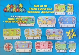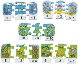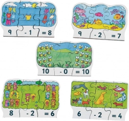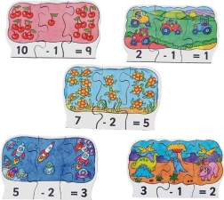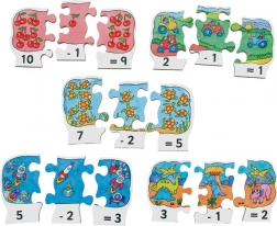 Lesena matematična sestavljanka, zasnovana za otroke, ki spreminja učenje matematike v zabavno igro. Vsebuje 10 nalog za vajo odštevanja.
