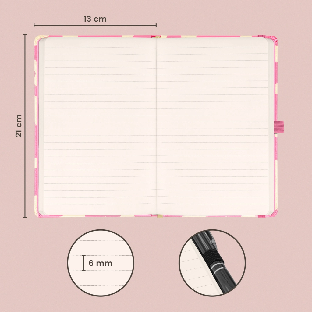 Stajliš rožnat zapisnik za vsak dan s trdimi platnicami, elastiko za zapiranje, zankico za svinčnik in notranjim žepom. Ponuja 172 pikčastih strani na rumenem papirju v priročnem formatu 13 × 21 cm za vaše ideje, zapiske in dnevnik.
