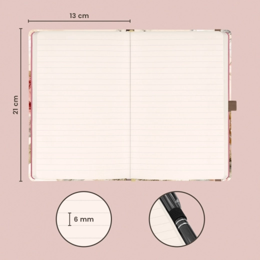Zapišite ideje, cilje in vsakodnevne misli v stilski zvezek NOTIQUE z nežnim cvetličnim dizajnom. Pikčast papir daje svobodo za pisanje, skiciranje in bullet journaling, medtem ko se praktični format 13 × 21 cm prilega tako v torbico kot v nahrbtnik.