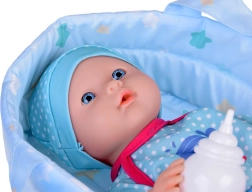 Ta set vsebuje vse, kar mali starši potrebujejo za nego svojih punčk – punčko z realističnimi potezami, nosilko za enostavno prenašanje in stekleničko za hranjenje. Punčka ima modre oči in je oblečena v moder komplet z motivom kita, kar igri nege dojenčka doda pristnost. Po pitju iz stekleničke punčka zna »lulati«, zato je ne le igrača, temveč tudi zabavno orodje za učenje najmlajših.