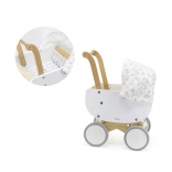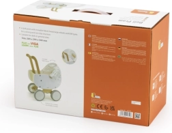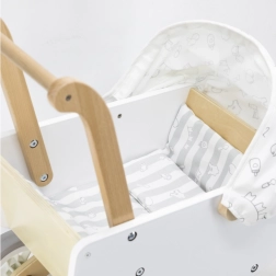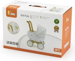 Leseni voziček Viga je idealna izbira za prve korake v svet skrbi za punčke. Združuje trdno leseno konstrukcijo z gladkimi robovi in protizdrsnimi kolesi EVA, da je igra varna in tekoča na različnih površinah. Svetle barve in tekstilna strešica z nežnim vzorcem delujejo čisto in moderno.