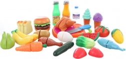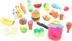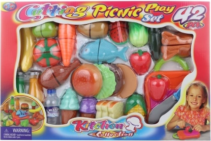 Odkrijte veselje do igre s kompletom za rezanje piknik igre, ki vsebuje 42 različnih plastičnih živil. Te igrače odlično posnemajo resnične sadeže, zelenjavo, ribe in druga živila, ki jih lahko otroci "režejo" s priloženim nožem. Idealno za zabavne trenutke preživljene v kuhinji.