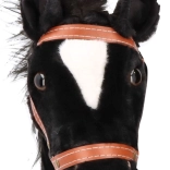 Realistično oblikovana konjska glava z rjavim uzdami in belim znakom dodata igri otrok avtentičnost in zabavo.