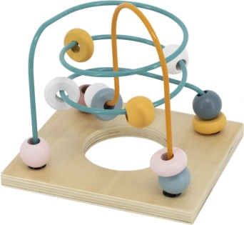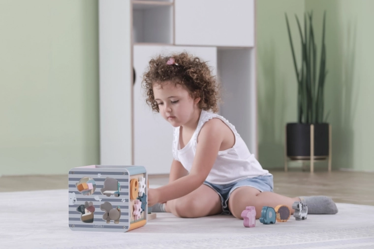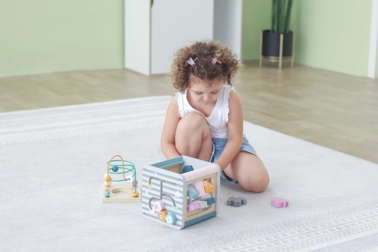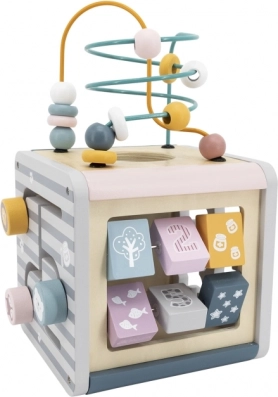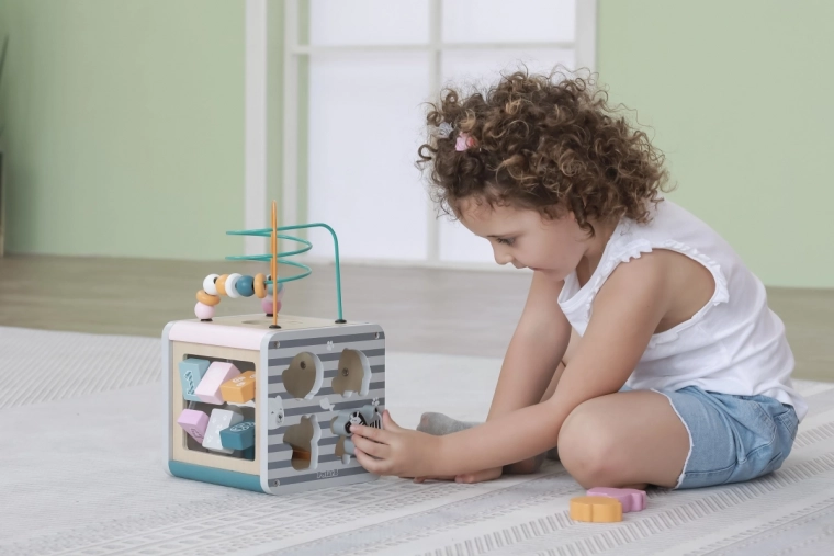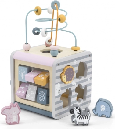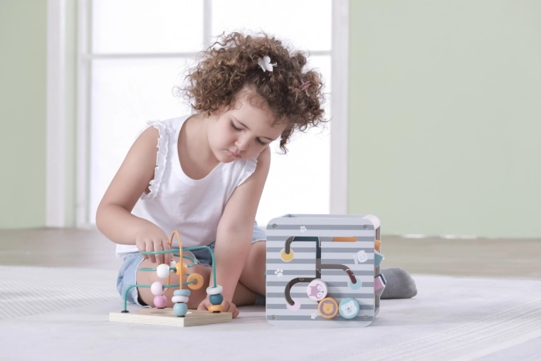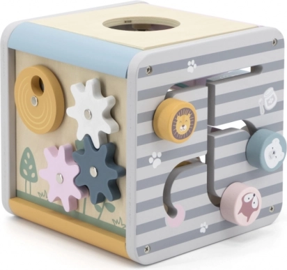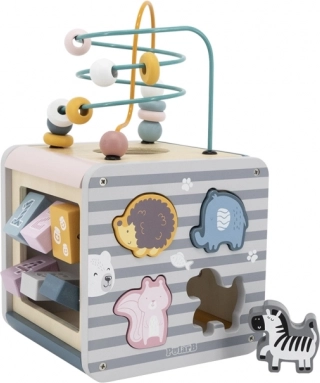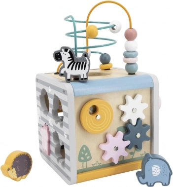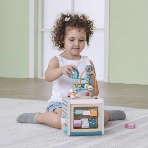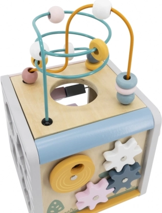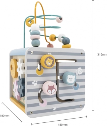 Na zgornji strani je žični labirint z biserčki za razvoj fine motorike in potrpežljivosti. Stranske ploskve skrivajo vstavljanko z živalmi, vrtljive kocke s števili za prve računske korake, zobnike za razumevanje vzroka in posledice ter drsne elemente za trening koordinacije.
