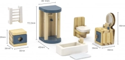 Minaturno pohištvo je dimenzionirano za običajne hišice; posamezne kose zlahka razporedite. Vzorčne mere: umivalnik 3 × 3 × 6 cm, omarica 2 × 3 × 2,8 cm, prha 4 × 4,5 × 7,22 cm.