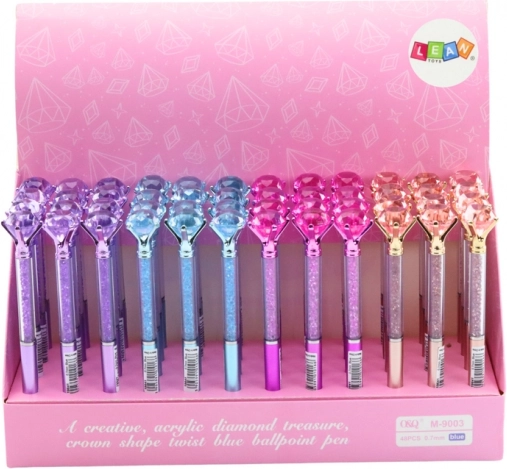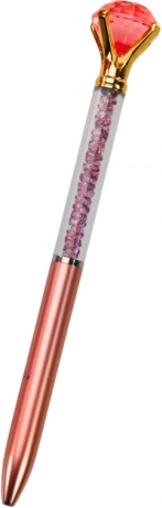 Stilski kemični svinčnik z velikim bleščečim »diamantom« na koncu in prozornim ohišjem, napolnjenim z drobnimi kamenčki. Piše gladko z modrim črnilom in konico 0,7 mm. Odličen kot eleganten modni dodatek za šolo, pisarno in kot darilo; na voljo v mešanici barv.