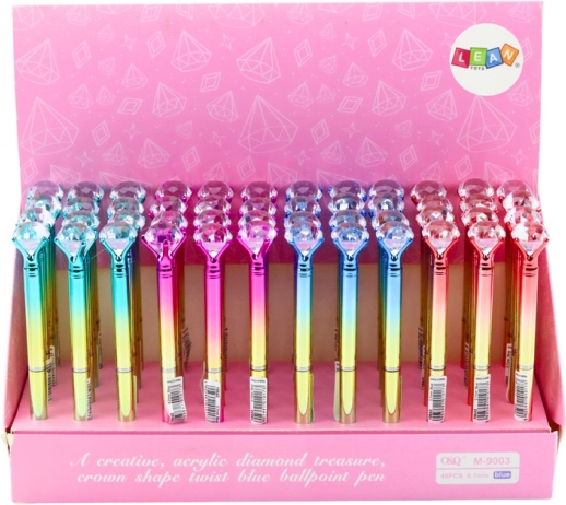 Eleganten kemični svinčnik z bleščečim diamantkom, zlato ohišje, modra polnitev 0,7 mm. Izbira barvnih poudarkov, gladko pisanje. CE, EN71, primerno od 3 let.