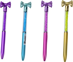 Eleganten kemični svinčnik z dekorativno mašnico in prozornim ohišjem, napolnjenim z bleščečimi kristalčki, doda pisanju edinstven pridih. Ima moder črnilo, konico 0,7 mm za tekoče pisanje in je na voljo v mešanici barv – vijolična, turkizna, rožnata in zlata.