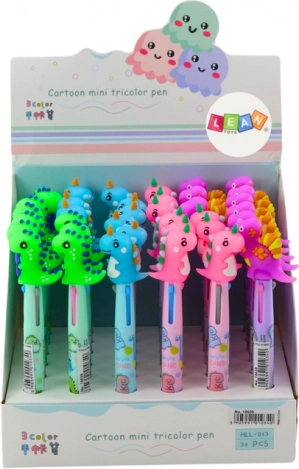Zabavno in praktično večbarvno pero z motivom dinozavra ponuja 3 barve črnila v enem ter enostavno preklapljanje s pomočjo bočnega drsnika. Odlično za pisanje in risanje, idealno za otroke od 3 let dalje, z certifikatom CE in skladnostjo z EN71.