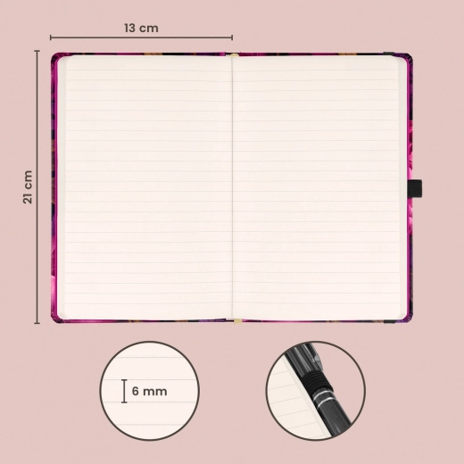 Slogoven črtni zvezek z motivom vijoličnih cvetov v dimenzijah 13 x 21 cm. Popoln za vsakodnevne zapiske in ideje.