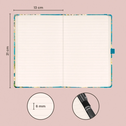 Zahvaljujoč praktičnim podrobnostim boste imeli vse pri roki: elastična guma beležnico varno zapre, zanka za svinčnik poskrbi za pisala, notranji žep pa skrije vizitke ali proste lističe. Črtani listi na prijetnem rumenem papirju podpirajo pregledne zapiske in dnevne vnose.