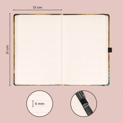 Stilski zvezek z motivom Gustava Klimta je odličen spremljevalec za vaše misli, skice in vsakodnevno načrtovanje. Pikčasta lineatura zagotavlja svobodo za ustvarjalno pisanje in grafično razporeditev strani, medtem ko kompaktne mere 13 × 21 cm olajšajo vsakodnevno prenašanje.