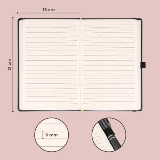 Črtna razporeditev olajša pregledno pisanje, praktična dimenzija 15 × 21 cm pa se prilega večini torb in nahrbtnikov. Površina balacron je enostavna za vzdrževanje in prijetna na dotik, zato bo vaš zvezek dolgo videti kot nov.