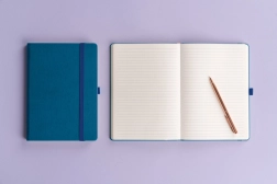 Stilska beležnica Notique Aprint v modri izvedbi združuje praktičnost in eleganco. Črtani listi omogočajo pregledno zapisovanje, medtem ko nežno teksturirana površina platnic deluje profesionalno in je primerna za branding.