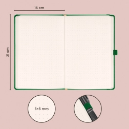 Zahvaljujoč pikčasti mreži boste zlahka pisali, risali in načrtovali. Format 15 × 21 cm (A5) je idealen za na pot, v torbo ali na pisalno mizo.