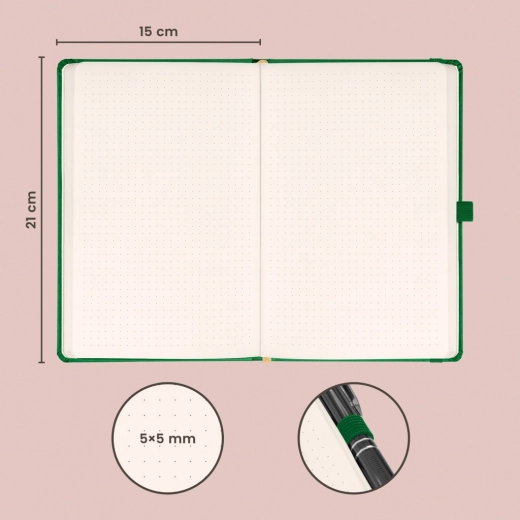 Stilska pikčasta beležnica NOTIQUE Aprint v elegantni zeleni barvi je idealna za vsakodnevne zapiske, načrtovanje in kreativno skiciranje. Ponuja pikčasto mrežo za natančno pisanje in risanje, format 15 × 21 cm za udobno prenašanje ter površino primerno za suho žigosanje/logotip z nežno strukturo.