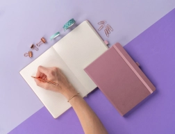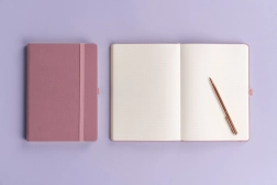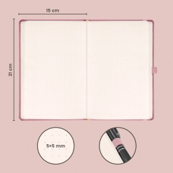 Praktičen format 15 × 21 cm (približno A5) se prilega torbi ali nahrbtniku, zato imate svoje misli vedno pri roki. Površina sodi med najbolj priljubljene – je prijetna na dotik in odporna za vsakodnevno uporabo.