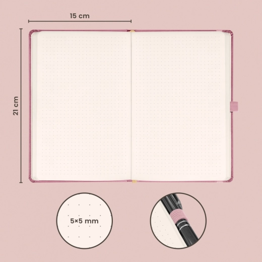 Sodoben pikčast zvezek Notique Aprint Neo v rožnati barvi je idealen za zapiske, skiciranje in bullet journal. Ponuja elegantno površino z nežno teksturo, na katero je mogoče enostavno vtisniti logotip podjetja, ter praktičen format 15 × 21 cm za vsakodnevno uporabo.