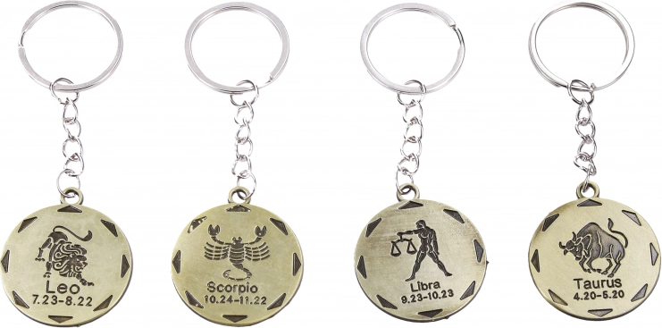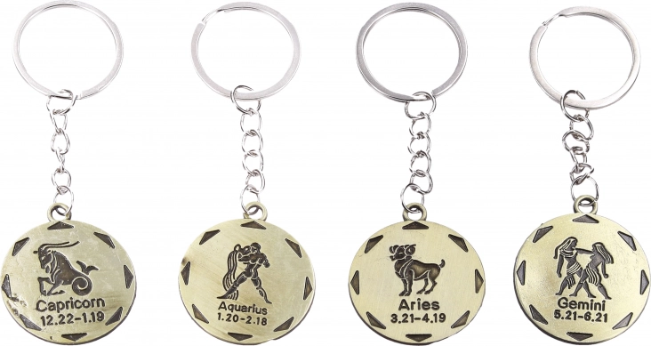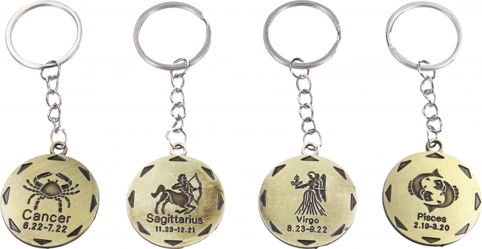 Stilski okrogel obesek za ključe z motivom zodiaka. Na voljo 12 znamenj – idealen dodatek za ključe, nahrbtnik ali torbico in odličen predlog za darilo.