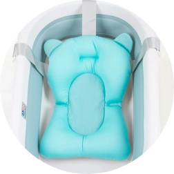 Za maksimalno udobje staršev je kadica opremljena z odprtino za priklop pršne cevi in praktičnim čepom za hitro izpuščanje vode brez dvigovanja. Nedrseče dno in stabilne nogice zagotavljajo varnost pri kopanju. Priložena je mehka blazina, ki podpira dojenčka in olajša rokovanje.