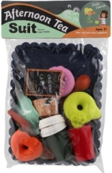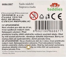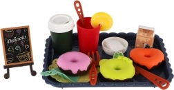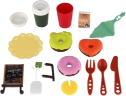 Vključuje okrasni modri pladenj, skodelico za kavo, majhen čajnik, stekleničko/kozarček, posodico za mleko, jedilni pribor in različne sladke dobrote. Komplet odlično razvija socialne veščine, komunikacijo in domišljijo pri igri s prijatelji.