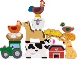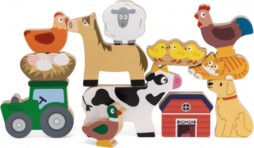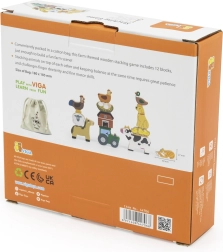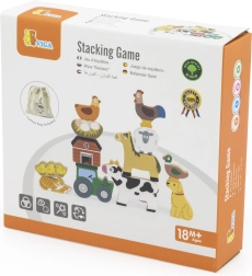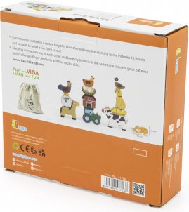 Ta leseni set vsebuje 12 kosov z motivom kmetije. Zlaganje živali eno na drugo in hkrati ohranjanje ravnotežja zahteva veliko potrpežljivosti, spretnost prstov in fino motoriko. Deli so zapakirani v tekstilni vrečki. Dimenzije pakiranja približno 16×15×4 cm. Dimenzije vrečke 18×18,5 cm. Starost 18m+