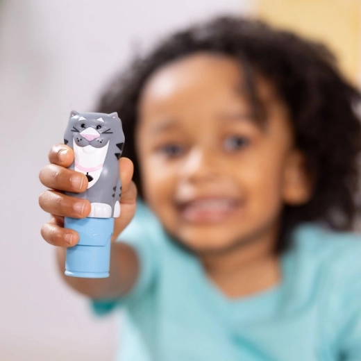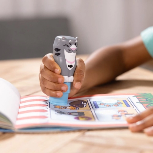 Uživajte v neskončnih možnostih z našim kompletom: žig v obliki sive mačke z belim gobčkom in rožnatim nosekcom, vstavni modul s 300 nalepkami na temo živali ter 24-stranska barvna knjiga, namenjena ustvarjanju lastne živalske pravljice.