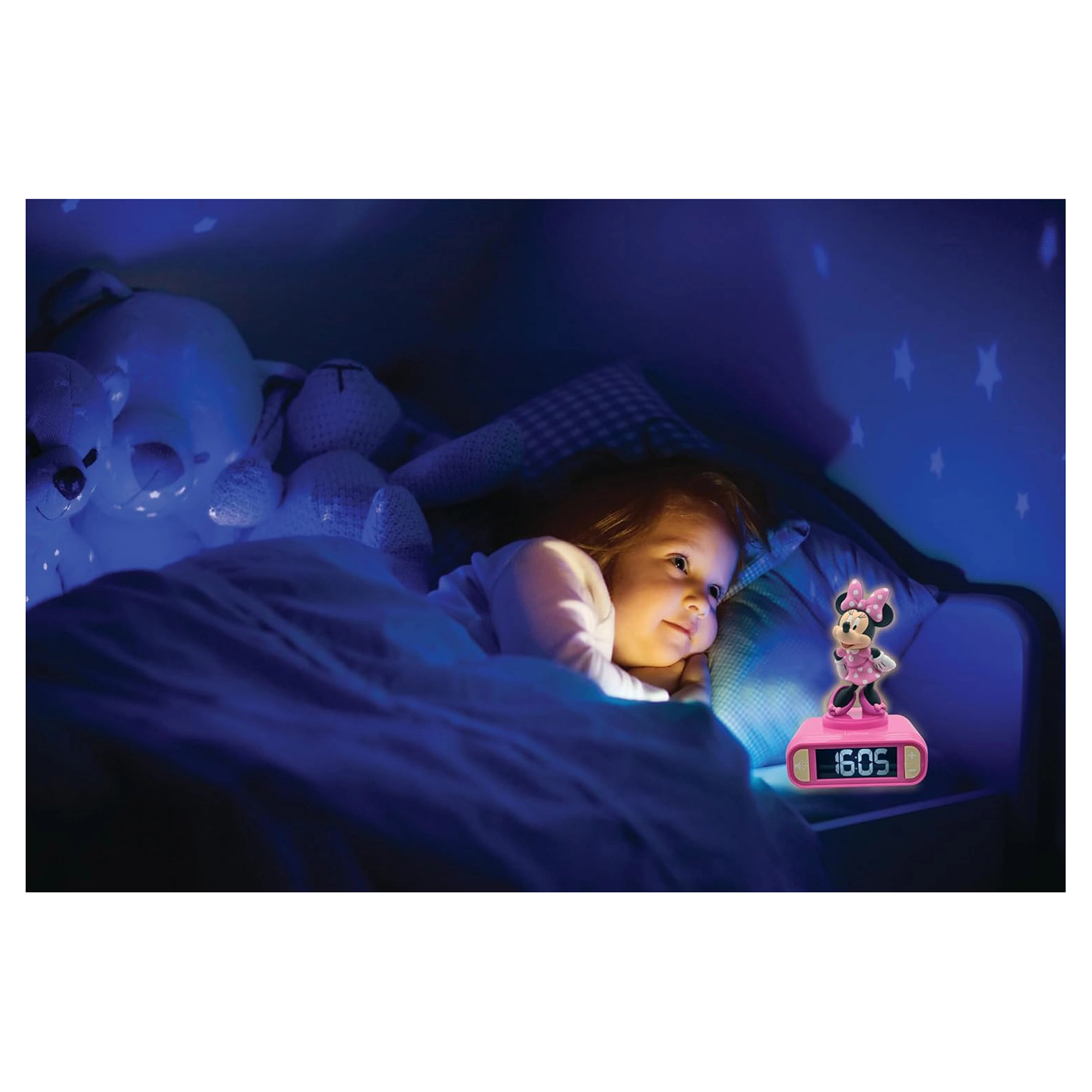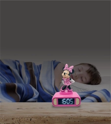 Prisrčna otroška budilka z motivom MINNIE prinaša mirne noči in prijetna jutra. Ponuja osvetljen LCD-zaslon, preklapljanje 12/24 h, 6 tematskih tonov alarma in zvočne učinke. Čarobna 3D nočna lučka se prižge z dotikom zgornjega dela ali ob zvonjenju, ima samodejni izklop, na voljo sta dremež 9 minut in nastavljiva glasnost. Odlično za učenje časa in samostojnost otrok.