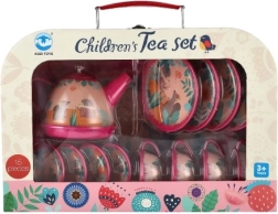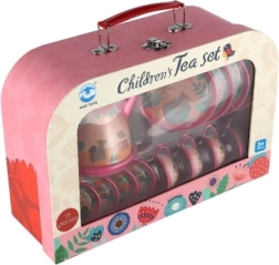 Ta otroški pločevinasti čajni set je odličen dodatek za vsako otroško kuhinjico. V praktičnem kovčku z ročajem se zlahka prenaša in pospravlja, zato je vedno pripravljen na novo čajanko. Zaradi čvrste izvedbe prenese navdušeno igranje in vsakodnevno uporabo.