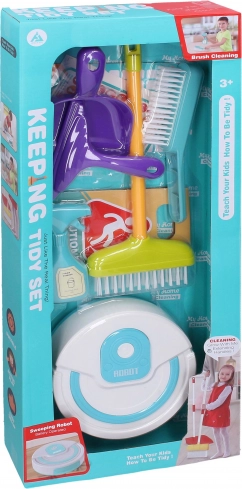 Zabaven komplet za čiščenje za otroke, ki vsebuje vse potrebno za igro čiščenja – od robotskega sesalnika do opozorilne table za mokra tla.