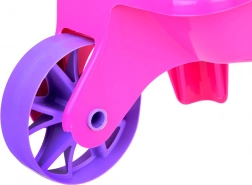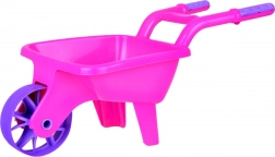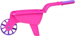 Roza samokolnica z vijoličnim kolesom je zasnovana za majhne roke – lahka, stabilna in idealna za prevažanje peska, igrač ali listja.