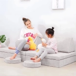 Zahvaljujoč lahkim blazinam z odstranljivimi prevlekami na zadrgo boste pohištvo brez truda ohranjali čisto. Nežen, siv dizajn se lepo poda v otroško sobo in igralnico, kakovostni materiali pa prenesejo vsakodnevno uporabo.