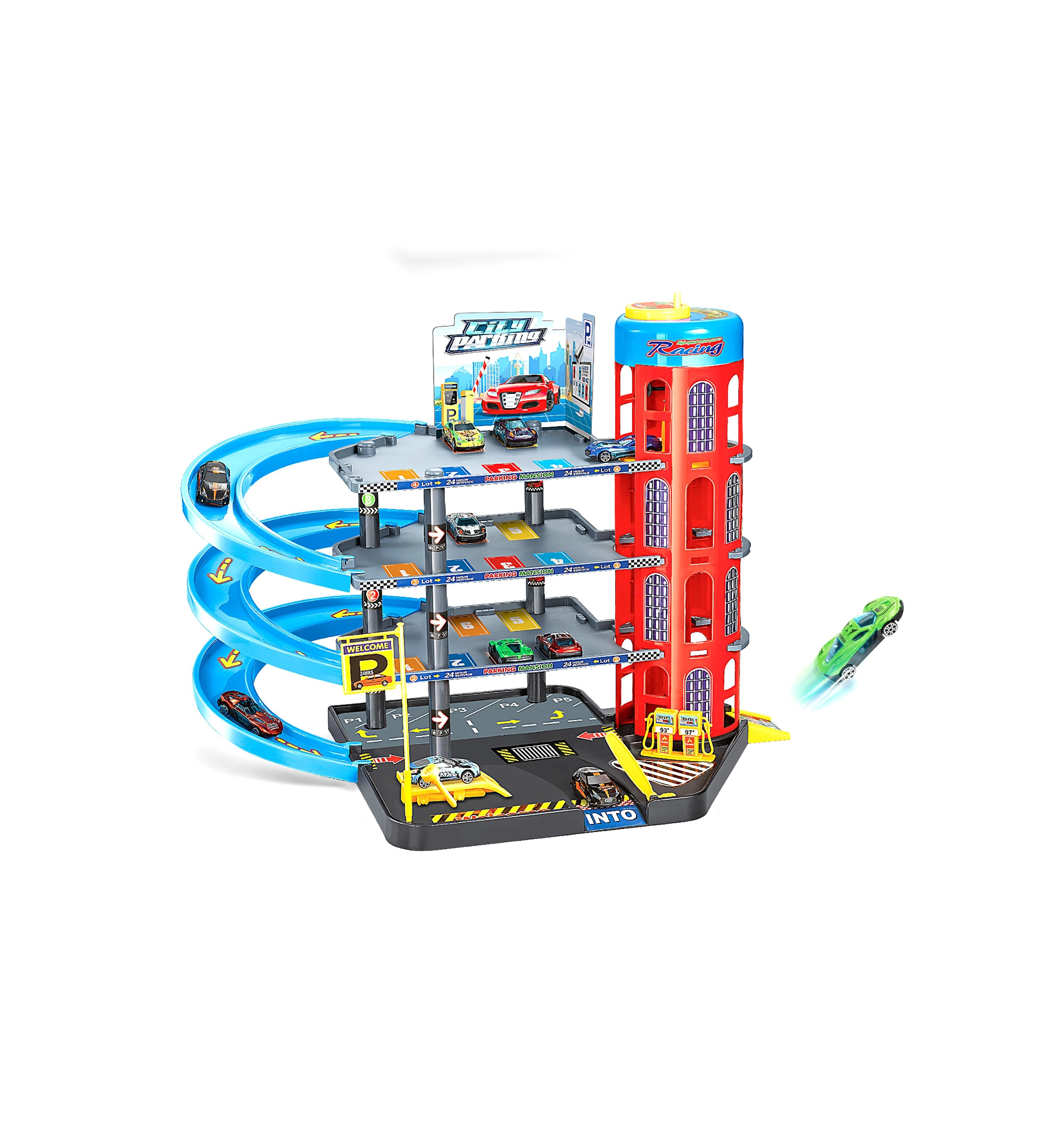 Otroci bodo uživali v realističnih elementih, kot so ročno dvigalo za premikanje avtov med nadstropji, bencinska črpalka za točenje goriva, polnilnica za električna vozila ter dvižna ploščad za “servis”. Del kompleta je tudi zapornica za usmerjanje prometa, kar celoten set spremeni v popoln igralni komplet.