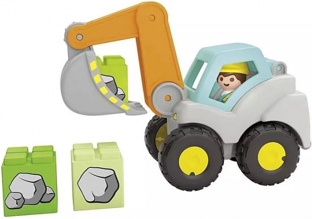 Varne, zaobljene oblike in izrazite barve so prilagojene otroškim ročicam. Deli se enostavno držijo, upravljanje z bagerjevim krakom pa naravno razvija koordinacijo oko–roka. Set je odličen za samostojno igro ali skupno gradnjo s starši.