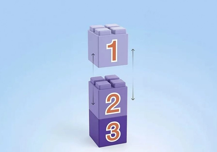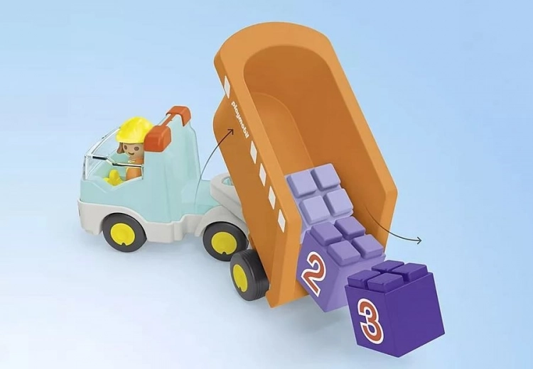 Ta pisani gradbeni set bo navdušil male voznike in prihodnje gradbovodje. Otroci lahko nalagajo »kamenje« skozi odprti zadnji del kesona, izpraznijo vsebino s pomočjo preklopnega nadstavka in znova ter znova ponavljajo zabaven cikel nalaganja in razlaganja. Tri oštevilčene kocke (1, 2, 3) naravno razvijajo osnove štetja in razvrščanje barv.