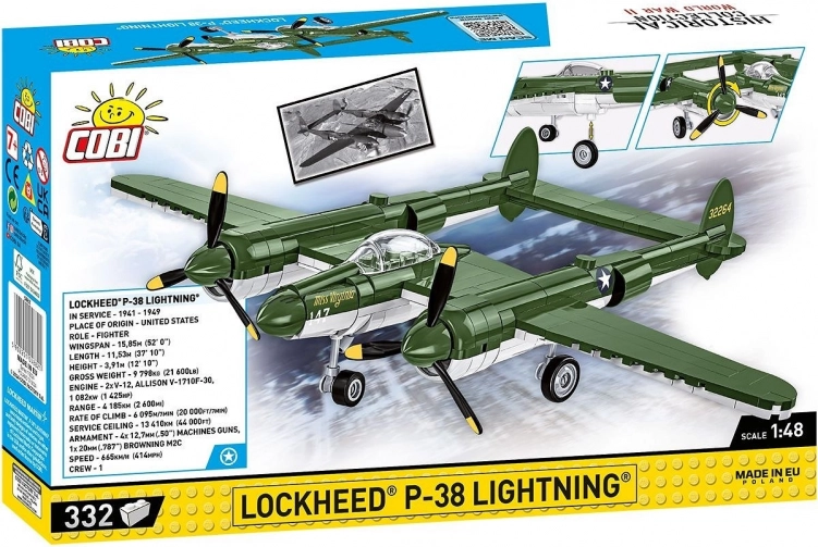 Gradbeni komplet LOCKHEED P-38 Lightning od COBI – 332 kosov, merilo 1:48, vrteči se propelerji, trpežni potiski, izdelano v EU z licenco Lockheed Martin.