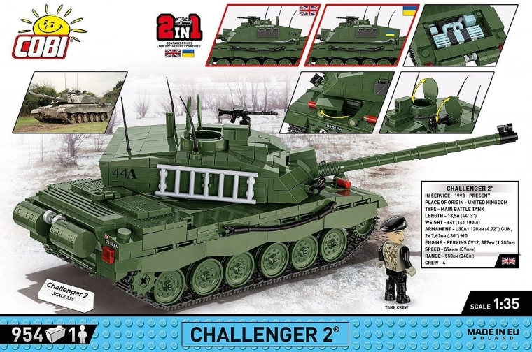 Odprite loputo v stolpu in posadite vanj priloženo figurico tankista z dvema različicama pokrival (čelada in baretka z britanskim emblemom). Izberite med dvema kompletoma nalepk in sestavite britansko ali ukrajinsko različico. Kocke COBI so izdelane v EU, imajo obstojne kakovostne potiske in so popolnoma združljive z drugimi znamkami.