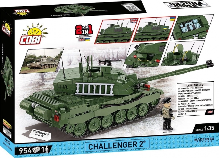 Uživajte v natančni izvedbi legendarnega britanskega glavnega bojnega tanka Challenger 2, znanega po vrhunski zaščiti in zanesljivosti. Sestavljanka v merilu 1:35 vsebuje 954 kosov in se po dimenzijah ujema z drugimi modeli iz serije Armed Forces. Za ta komplet je bil razvit poseben del značilne cevi, ne manjka vrtljiv stolp in top, premične gosenice ter podrobno oblikovan motor pod servisnim pokrovom.