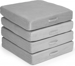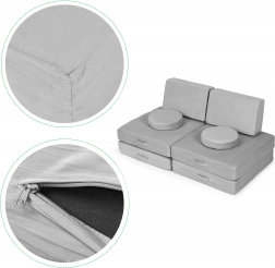 Zahvaljujoč lahkim elementom z ročaji lahko otroci pohištvo zlahka sami prenašajo in sestavljajo. Snemljive prevleke z zadrgo poenostavijo vzdrževanje – le snamete in operete. Nevtralna siva izvedba se odlično poda v sodoben interier in prenese vsakodnevno uporabo.