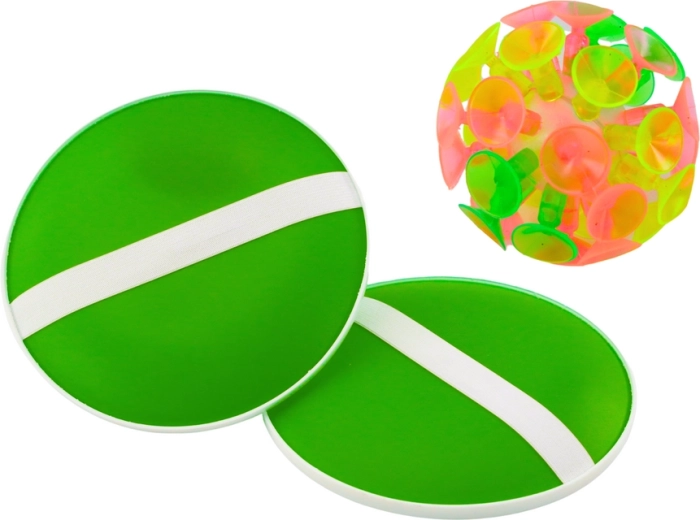 Spretnostna igra z okroglimi loparji in žogico s priseski je odlična zabava za vso družino. Lahke in enostavno vodljive igrače omogočajo hitro in dinamično izmenjavo med igralci na svežem zraku. Prožna žogica s priseski se trdno pritrdi na loparje, kar prinaša nepozabno zabavo.