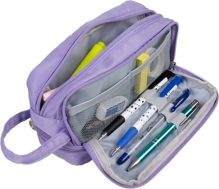 Odkrijte praktičen in stilski šolski peresnik, ki združuje eleganco in funkcionalnost. Peresnik je izdelan iz trpežnega najlona, kar zagotavlja dolgo življenjsko dobo pri vsakodnevni uporabi. Njegov lep vijoličen odtenek daje moderen videz, trije predelki pa ponujajo veliko prostora za shranjevanje.