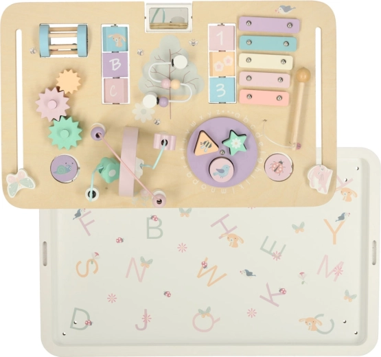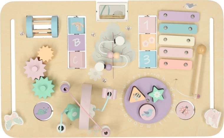 Na plošči boste našli cim bale s palčko, labirint s kroglicami, vrtljive in drsne elemente ter sortirnik oblik. Te dejavnosti razvijajo ročno spretnost, koncentracijo in prostorsko predstavo, medtem ko les in nežne barve spodbujajo umirjeno igro.