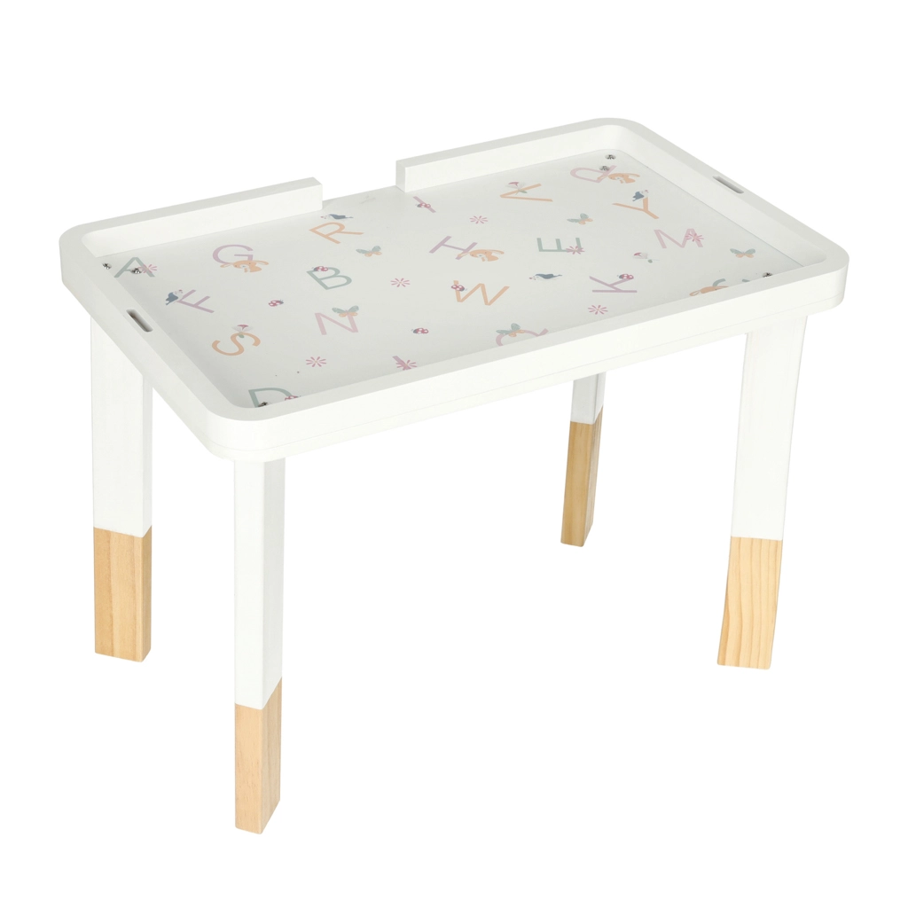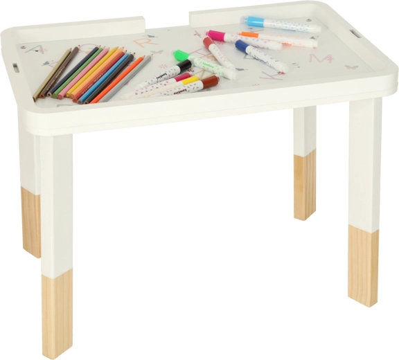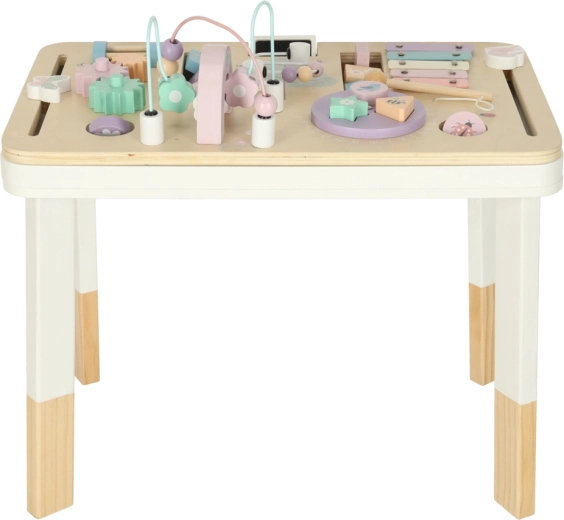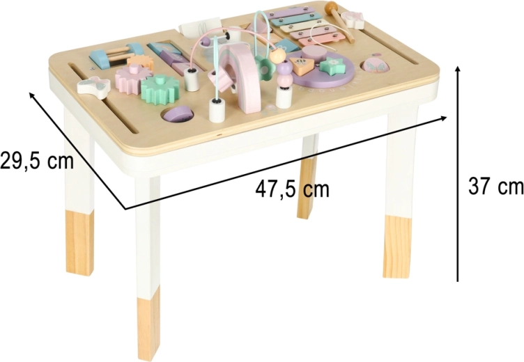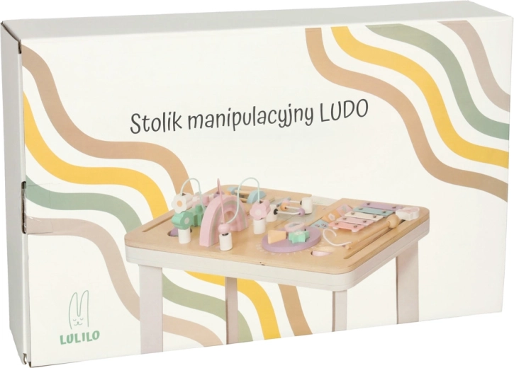 Lesena izobraževalna mizica LULILO LUDO je majhno domače “izobraževalno središče”, ki ponuja raznolike senzorične dražljaje in podpira samostojno igro. Pastelni elementi, gladki robovi in stabilna konstrukcija ustvarjajo varno okolje za radovedno raziskovanje.