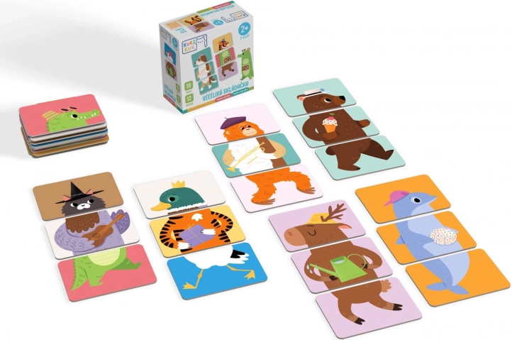 18 dvostranskih kart, ki prikazujejo 12 živalc, ponuja veliko možnosti sestavljanja, ki bodo otroke zabavale dolgo časa.
