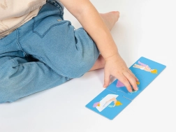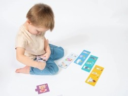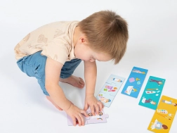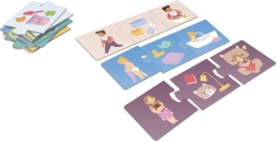 Na levem koščku je otrok, pripravljen na dejavnost, v sredini so pripomočki ali igrače, na desnem koščku pa je sama aktivnost. Iz 24 trdnih koščkov (2 mm karton) sestavite 8 tematskih trojic, lahko pa jih razvrstite tudi kot časovno os dneva.